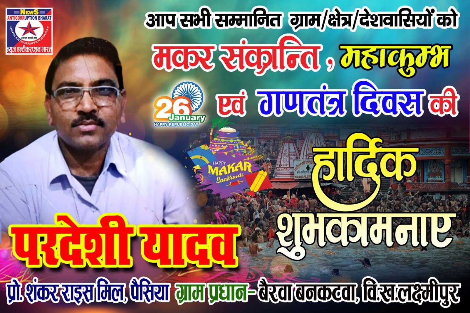 *आप सभी सम्मानित साथियों को मकर संक्रांति महाकुंभ महापर्व पर हार्दिक-हार्दिक शुभकामनाएं————-परदेसी यादव-प्रो, शंकर राईस पैसियां-ग्राम प्रधान,बैरवा बनकटवा, लक्ष्मीपुर-महाराजगंज*