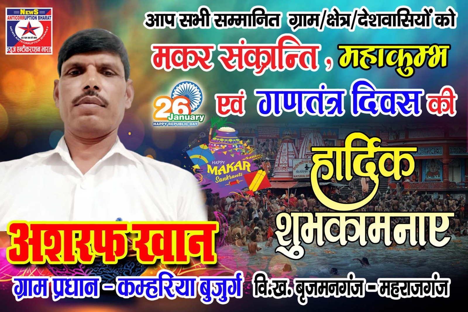 *आप सभी सम्मानित साथियों को मकर संक्रांति महाकुंभ पर्व एवं 26 जनवरी की हार्दिक-हार्दिक शुभकामनाएं————-अशरफ खान-ग्राम प्रधान कम्हरिया बुजुर्ग-विकासखंड बृजमनगंज-महाराजगंज*