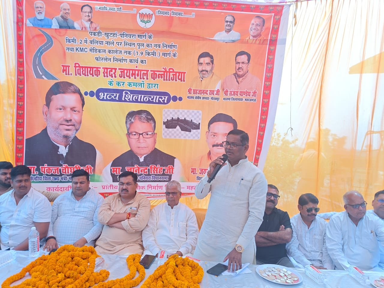 महाराजगंज 16अप्रैल। क्षेत्रीय विकास को बढ़ावा देते हुए पनियरा विधायक ज्ञानेंद्र सिंह और सदर विधायक जय मंगल कन्नौजिया ने आज पकड़ी खुटहा मार्ग पर वर्षों से क्षतिग्रस्त बलिया नाले पर पुल और फरेंदा महाराजगंज एन एच से के एम सी मेडिकल कॉलेज तक फोर लेन सड़क निर्माण परियोजना की आधारशिला रखी। इस अवसर पर बड़ी संख्या में ग्रामीण, जनप्रतिनिधि, प्रधान गण,अधिकारी और स्थानीय नागरिक मौजूद रहे। इस अवसर पर पनियरा विधायक ज्ञानेंद्र सिंह ने कहा कि करीब 1.9 किलोमीटर लंबी इस सड़क और बलिया नाले पर बनने वाले पुल की अनुमानित लागत क्रमशः 2747.48लाख,358.13 लाख रुपये है। इस परियोजना के पूर्ण हो जाने से न सिर्फ आवागमन सुगम होगा पनियरा से जिला मुख्यालय तक जाने वालो को अधिक दूरी तय करके मुख्यालय जाने से निजात मिलेगी वहीं आसपास के ग्रामीणों को भी लगभग 10 किमी तक की दूरी तय नहीं करना होगा और पहले की तरह कम समय और कम दूरी में अपने गंतव्य तक पहुंच भी आसान हो जाएगी। उन्होंने कहा कि विकास हमारी प्राथमिकता में शामिल है। हर गांव मुख्य सड़क से कनेक्ट हो इसके लिये हम सभी हमेशा फिक्रमंद रहते हैं। पूर्व की गैर भाजपाई सरकारों के एजेंडे में विकास नहीं परिवार का विकास होता था। आज योगी आदित्यनाथ जी की सरकार में प्रदेश का परिदृश्य बदल चुका है।उन्होंने कहा कि नवनिर्मित सड़क से क्षेत्रवासियों को आवागमन में सुविधा होगी। साथ ही उन्होंने कहा कि क्षेत्र के सभी जर्जर सड़कों के निर्माण के लिए चरणबद्ध तरीके से हमेशा प्रयास है लोग कर रहे है। सदर विधायक जयमंगल कन्नौजिया ने कहा यह पुल और सड़क सिर्फ ईंट, गिट्टी और सीमेंट का ढांचा नहीं है, बल्कि यह हमारे क्षेत्र की प्रगति की नई राह है। इससे हमारे किसान, छात्र और व्यापारी सभी को लाभ होगा। उन्होंने यह भी बताया कि इस परियोजना को धरातल पर उतारने के लिए बड़े भाई पनियरा विधायक ज्ञानेंद्र सिंह जी ने मेरे साथ कई बार मुख्यमंत्री और विभाग के उच्च अधिकारियों तक प्रयास किया। यशस्वी मुख्यमंत्री योगी आदित्यनाथ और भारत सरकार के केंद्रीय वित्त मंत्री पंकज चौधरी जी के आशीर्वाद से आज पकड़ी खुटहा मार्ग पर बलिया नाले पर वर्षों सेव टूटे पुल और पकड़ी चौराहे से मेडिकल कॉलेज तक फोर लेन सड़क के निर्माण की स्वीकृत मिली। उन्होंने कहा कि जब से उत्तर प्रदेश में भारतीय जनता पार्टी की योगी नीत सरकार बनी विकास की गंगा बहनी शुरू हुई। आज सभी प्रमुख सड़के बनी, मेडिकल कॉलेज बना, जर्जर रोडवेज स्टेशन बन कर कार्य कर रहा है।जिला मुख्यालय पर मुख्य डाक घर प्रारंभ है। मुख्यालय पर करोड़ों की लागत से ऑडिटोरियम के निर्माण की प्रक्रिया शुरू है, घुघली से फरेंदा तक रेल लाइन का कार्य भी शुरू है ।नेताद्वय ने जनता को भरोसा दिलाया कि नि