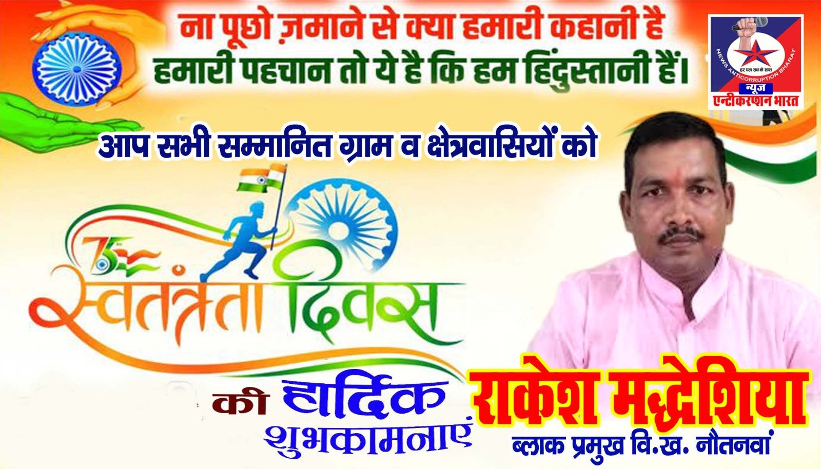 *आप सभी सम्मानित साथियों क्षेत्रवासियों, प्रदेशवासियों एवं देशवासियों की स्वतंत्रता दिवस की हार्दिक-हार्दिक शुभकामनाएं——————- राकेश मद्धेशिया-प्रमुख-विकासखंड नौतनवा- जनपद-महाराजगंज-उत्तर प्रदेश*