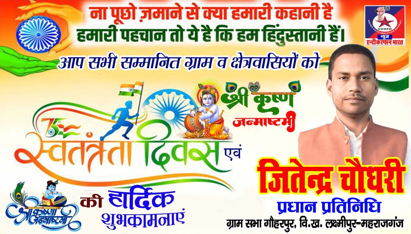 *आप सभी सम्मानित साथियों एवं ग्रामवासियों, क्षेत्रवासियों,नगरवासियों को स्वतंत्रता दिवस एवं कृष्ण जन्मोत्सव की हार्दिक-हार्दिक शुभकामनाएं————-जितेंद्र चौधरी- प्रधान प्रतिनिधि ग्रामसभा गौहरपुर,लक्ष्मीपुर,महाराजगंज*