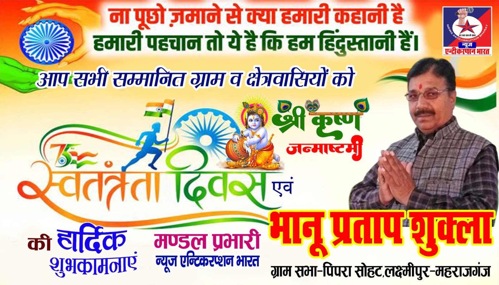 आप सभी सम्मानित साथियों ग्रामवासियों,क्षेत्रवासियों, नगरवासियों को स्वतंत्रता दिवस एवं श्री कृष्ण जन्माष्टमी की हार्दिक हार्दिक शुभकामनाएं————-भानुप्रताप शुक्ला न्यूज़ एंटीकरप्शन भारत-ग्राम पिपरा सोहट-लक्ष्मीपुर महाराजगंज
