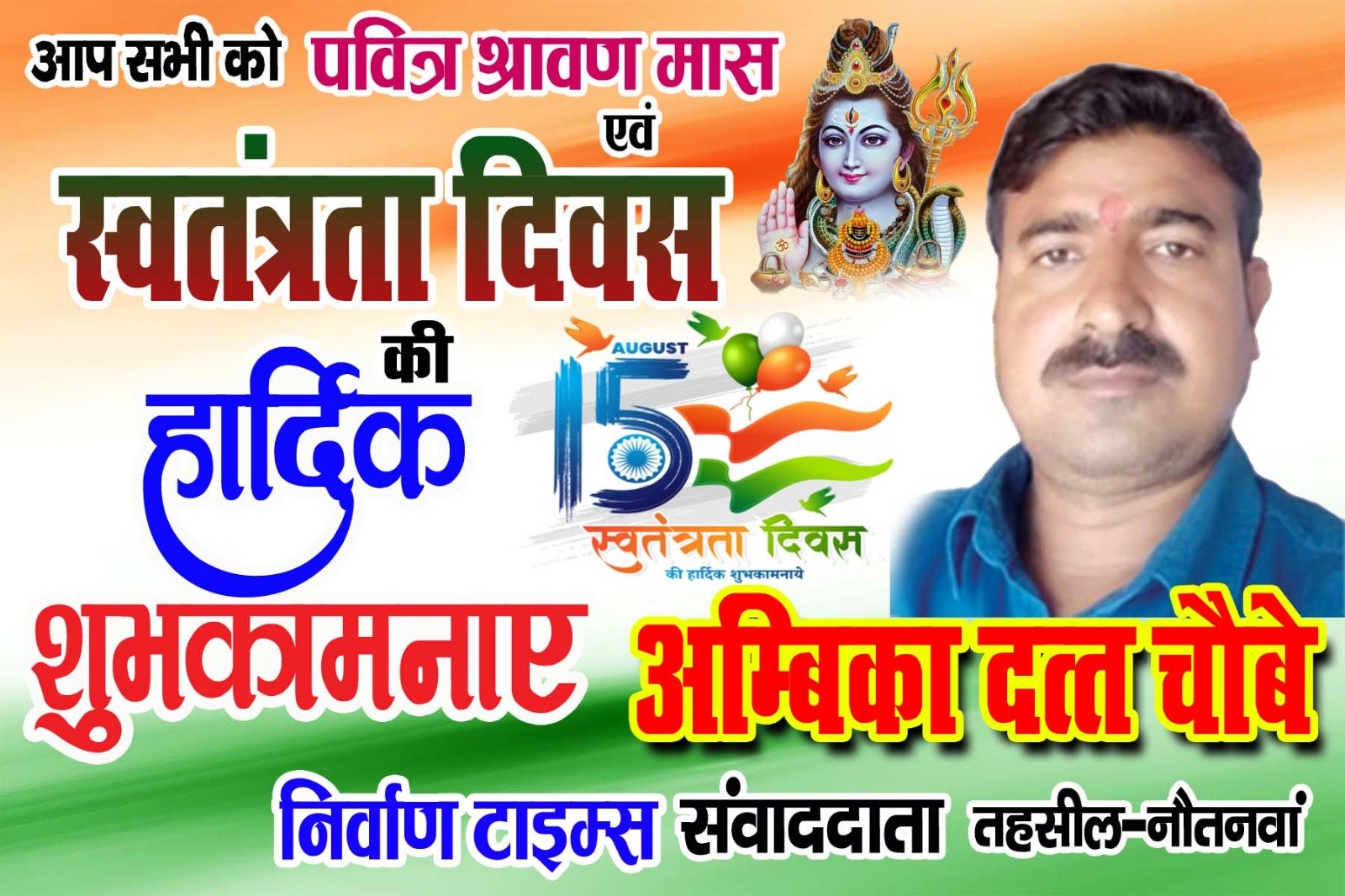 *पवित्र सावन मास एवं स्वतंत्रता दिवस की आप सभी सम्मानित क्षेत्रवासियों, नगरवासियों, देशवासियों को हार्दिक हार्दिक शुभकामनाएं—————अम्बिका दत्त चौबे-रिपोर्टर निर्वाण टाईम्स नौतनवां-महाराजगंज*