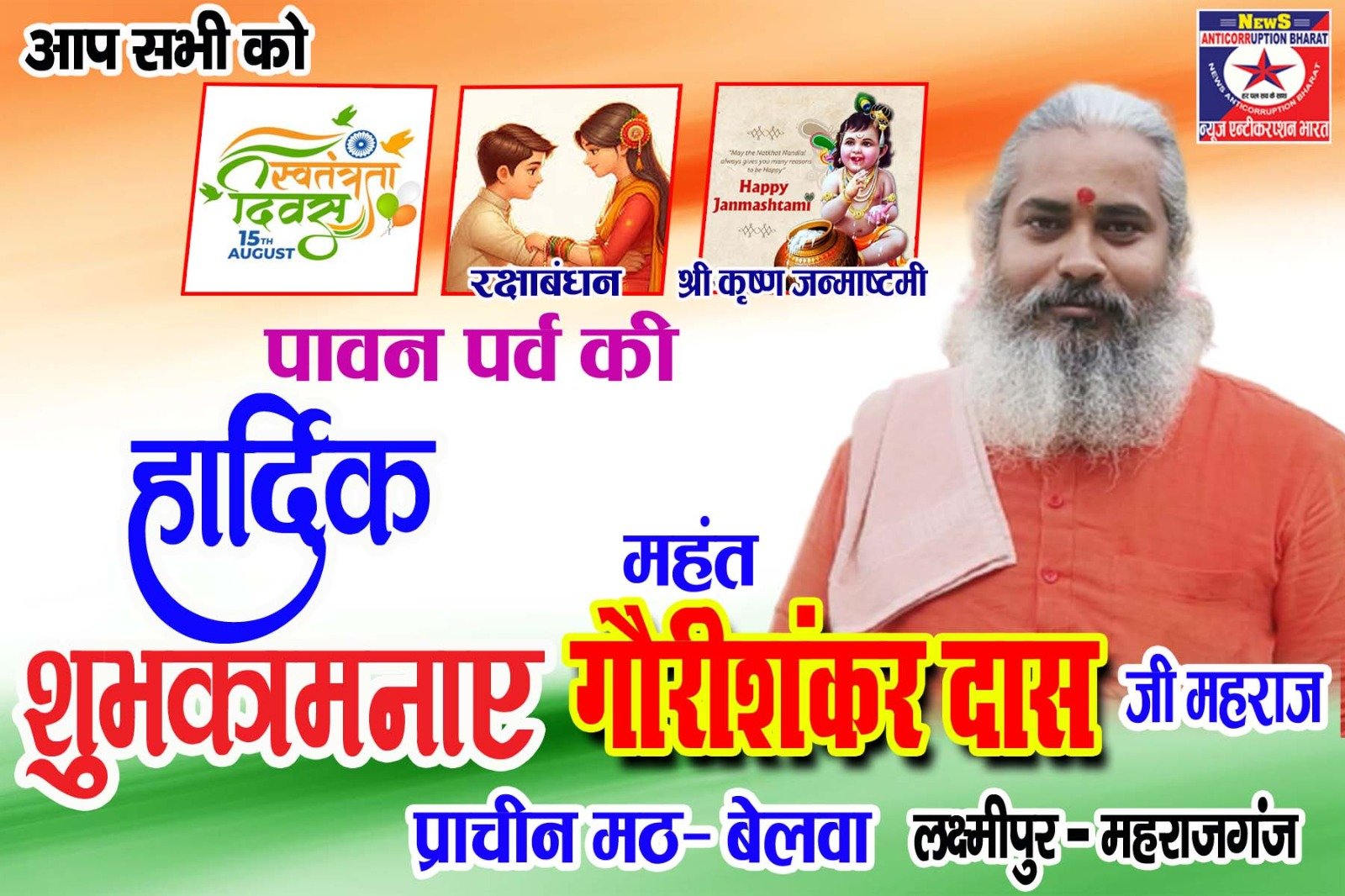 *पवित्र सावन मास एवं स्वतंत्रता दिवस, रक्षाबंधन की आप सभी सम्मानित क्षेत्रवासियों, नगरवासियों, देशवासियों को हार्दिक हार्दिक शुभकामनाएं—————महंत गौरीशंकरदास जी महाराज-प्राचीन मठ बेलवा -लक्ष्मीपुर-महाराजगंज*