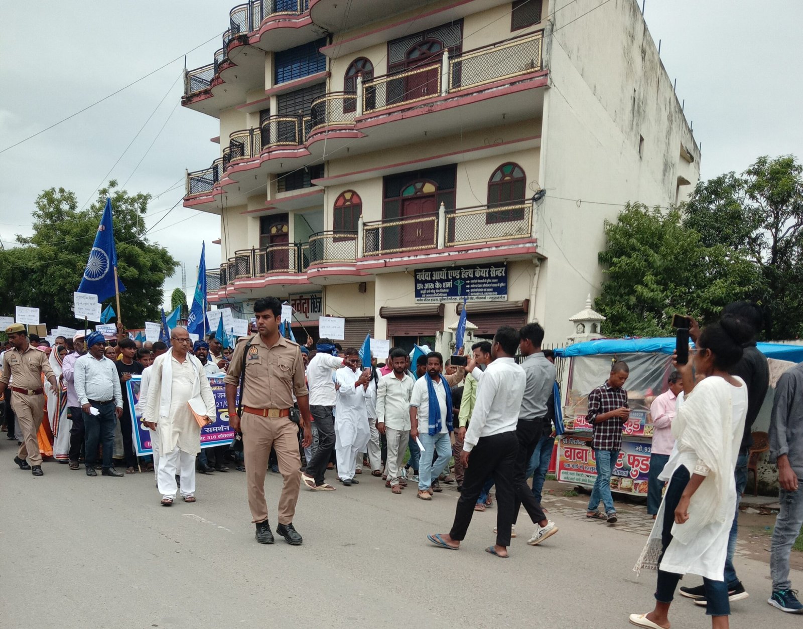 नौतनवा महाराजगंज। एससी एसटी के आरक्षण में क्रीमी लेयर के सुप्रीम कोर्ट के प्रस्ताव के विरोध में भीम आर्मी की ओर से बुधवार को भारत बंद के आह्वान का नौतनवा में कोई असर नहीं रहा भीम आर्मी के कार्यकर्ताओं ने नौतनवा में जुलूस निकालकर अपना विरोध दर्ज कराया भीम आर्मी का जुलूस नौतनवा रेलवे स्टेशन से शुरू होकर मुख्य मार्ग से होते हुए तहसील में पहुंचा जहां कार्यकर्ताओं ने महामहिम राष्ट्रपति को संबोधित ज्ञापन पत्र उप जिलाधिकारी नौतनवा नंदकुमार मौर्य के माध्यम से भेजा है। शांति व्यवस्था बनाए रखने के लिए थानाध्यक्ष नौतनवा धर्मेंद्र सिंह पूरे दलबल के साथ लग रहे। जुलूस में दो दर्जन से अधिक संख्या में कार्यकर्ता मौजूद रहे।