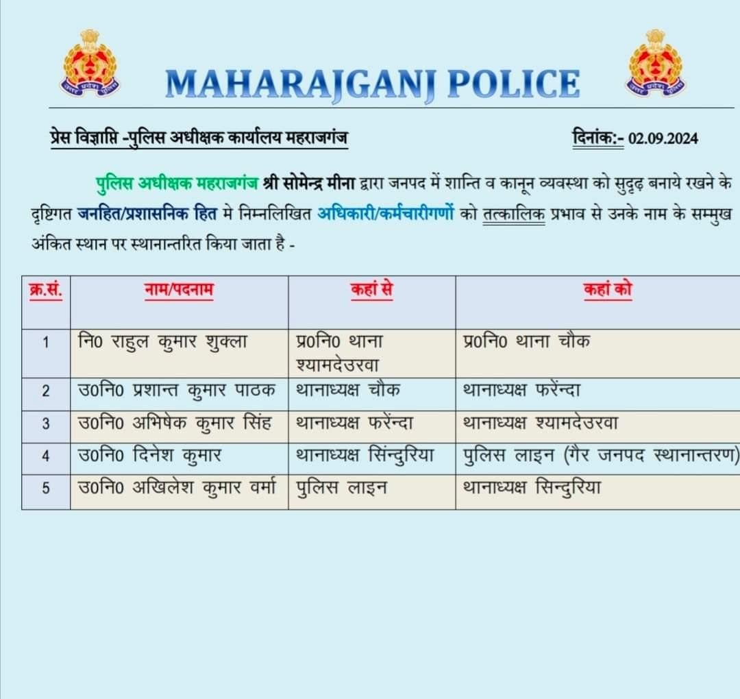 महाराजगंज पुलिस अधीक्षक सोमेंद्र मीना जनपद में शांति व कानून व्यवस्था को सुदृढ़ बनाए रखने के लिए जनहित/प्रशासनिकहित में निरीक्षक राहुल कुमार शुक्ला को थाना श्यामदेउरवा से थाना चौक, उप निरीक्षक अभिषेक कुमार सिंह थाना फरेंदा से हटाकर थानाध्यक्ष श्यामदेउरवा, उपनिरीक्षक प्रशांत कुमार पाठक को थानाध्यक्ष चौक से थानाध्यक्ष फरेंदा, उपनरीक्षक अखिलेश कुमार वर्मा को पुलिस लाइन से हटाकर थानाध्यक्ष सिंदुरिया बनाया, वहीं उप निरीक्षक दिनेश कुमार को थानाध्यक्ष सिंदुरिया से पुलिस लाइन (गैर जनपद स्थानांतरण) किया है।