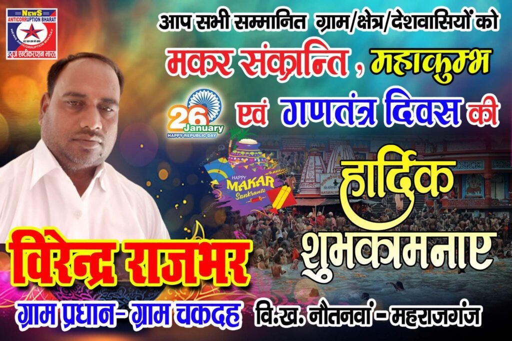 *आप सभी सम्मानित साथियों को मकर संक्रांति, महाकुंभपर्व, एवं गणतंत्रदिवस कि हार्दिक-हार्दिक शुभकामनाऐं------------वीरेंद्र राजभर- प्रधान-ग्राम सभा चकदह,नौतनवा,महाराजगंज*