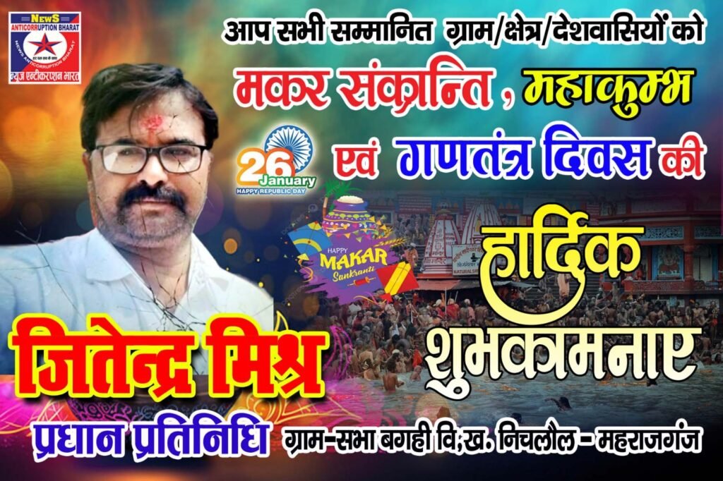 *आप सभी सम्मानित साथियों को मकर संक्रांति, महाकुंभपर्व, एवं गणतंत्रदिवस कि हार्दिक-हार्दिक शुभकामनाऐं------------जितेंद्र मिश्र-प्रधान प्रतिनिधि-ग्राम बगही निचलौल,महाराजगंज*