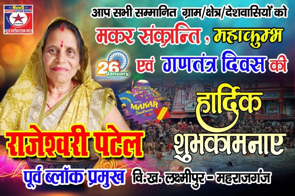 *आप सभी सम्मानित साथियों को मकर संक्रांति, महाकुंभपर्व, एवं गणतंत्रदिवस कि हार्दिक-हार्दिक शुभकामनाऐं------------राजेश्वरी पटेल-पूर्व ब्लॉक प्रमुख लक्ष्मीपुर,महाराजगंज*