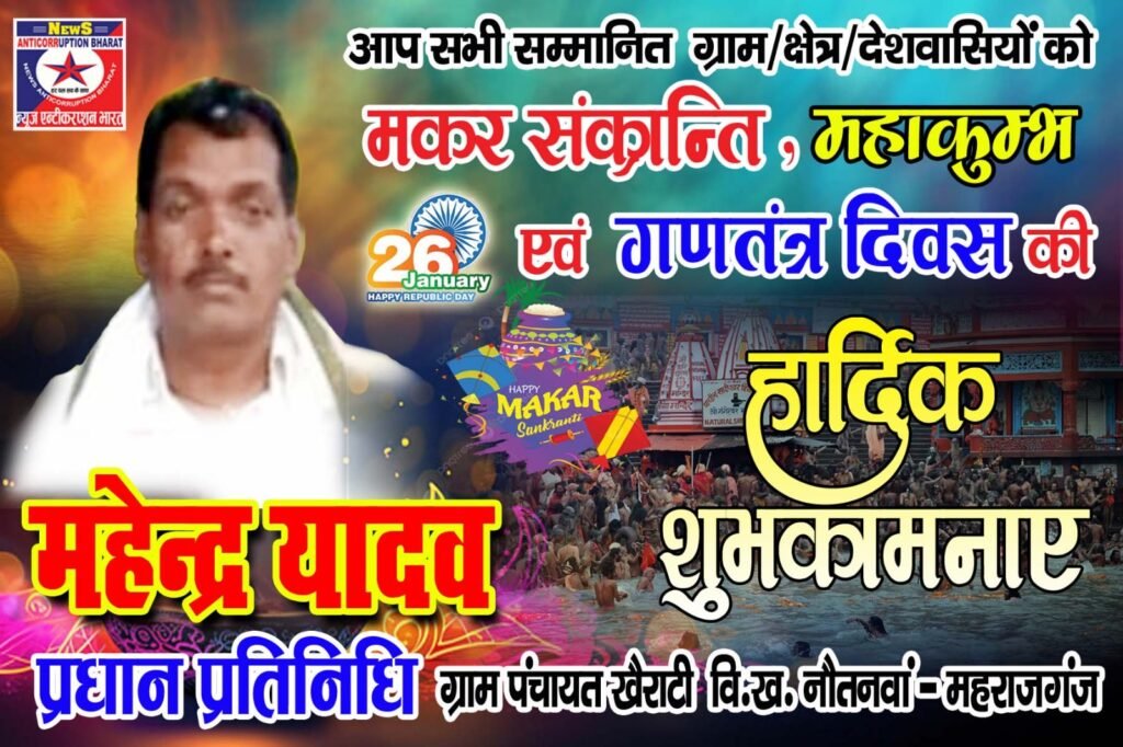 *आप सभी सम्मानित साथियों को मकर संक्रांति, महाकुंभपर्व, एवं गणतंत्रदिवस कि हार्दिक-हार्दिक शुभकामनाऐं------------महेंद्र यादव-प्रधान-प्रतिनिधि ग्रामसभा खैराटी, नौतनवा, महाराजगंज*
