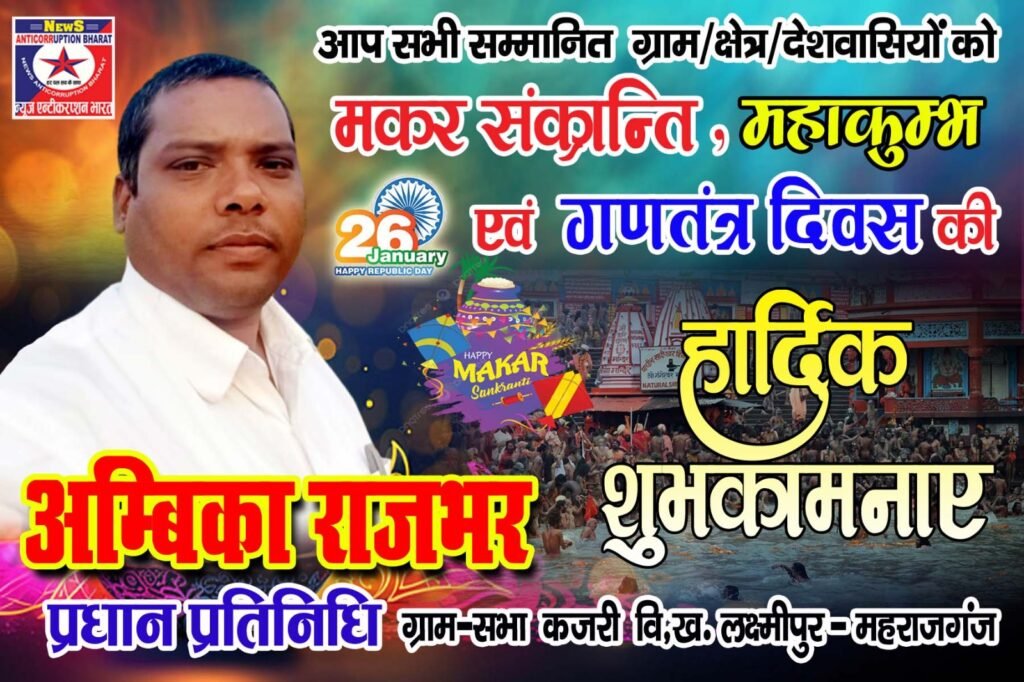 *आप सभी सम्मानित साथियों को मकर संक्रांति, महाकुंभपर्व, एवं गणतंत्रदिवस कि हार्दिक-हार्दिक शुभकामनाऐं------------अंबिका राजभर-प्रधान प्रतिनिधि ग्रामसभा,कजरी,लक्ष्मीपुर,महाराजगंज*