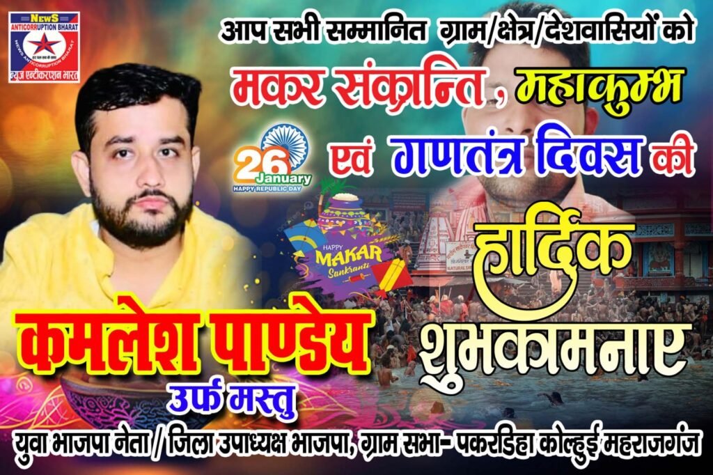 *आप सभी सम्मानित साथियों को मकर संक्रांति महाकुंभ पर्व एवं 26 जनवरी की हार्दिक-हार्दिक शुभकामनाएं-------------कमलेश पांडे उर्फ मस्तु-युवा भाजपा नेता/समाजसेवी-पकरडिहा-कोल्हुई-महराजगंज*