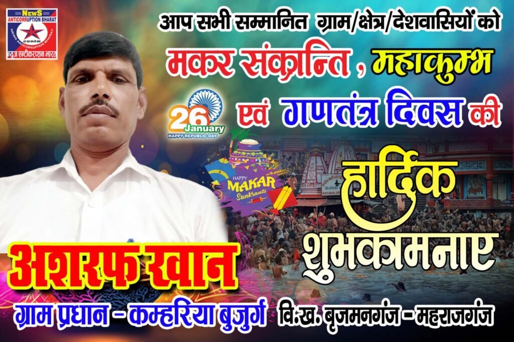 *आप सभी सम्मानित साथियों को मकर संक्रांति महाकुंभ पर्व एवं 26 जनवरी की हार्दिक-हार्दिक शुभकामनाएं-------------अशरफ खान-ग्राम प्रधान कम्हरिया बुजुर्ग-विकासखंड बृजमनगंज-महाराजगंज*